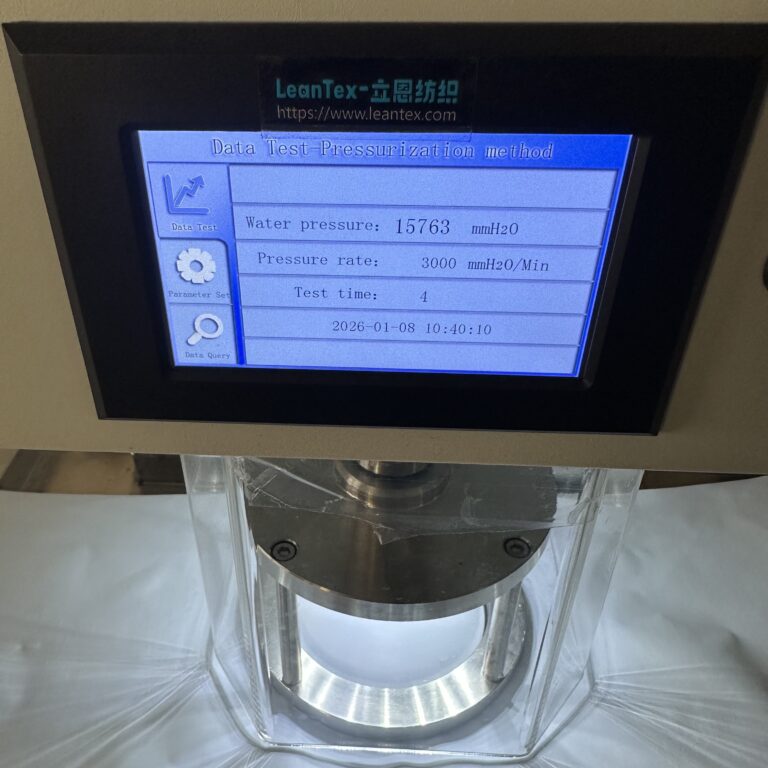 Waterproof test photo for 15K is for reference. Hydrostatic head depends on coating recipe, thickness, and test method (ISO 811 / AATCC 127). If you have a target rating (e.g., 3K/5K/10K), share your end use and we’ll recommend the best finishing option and provide samples.